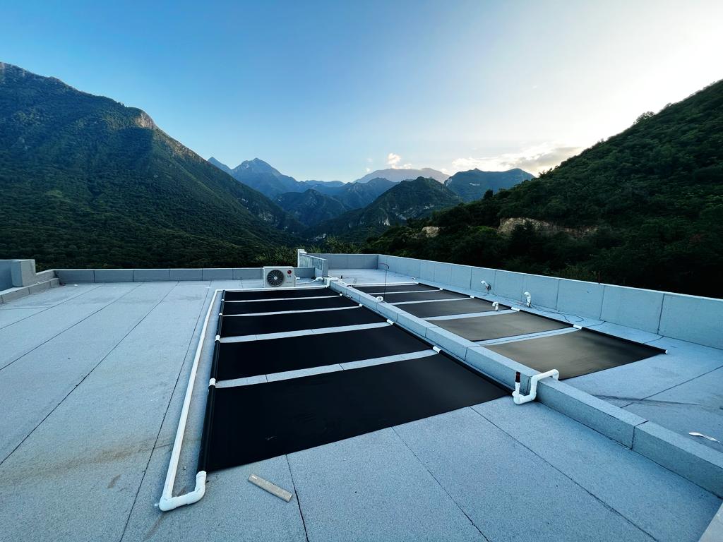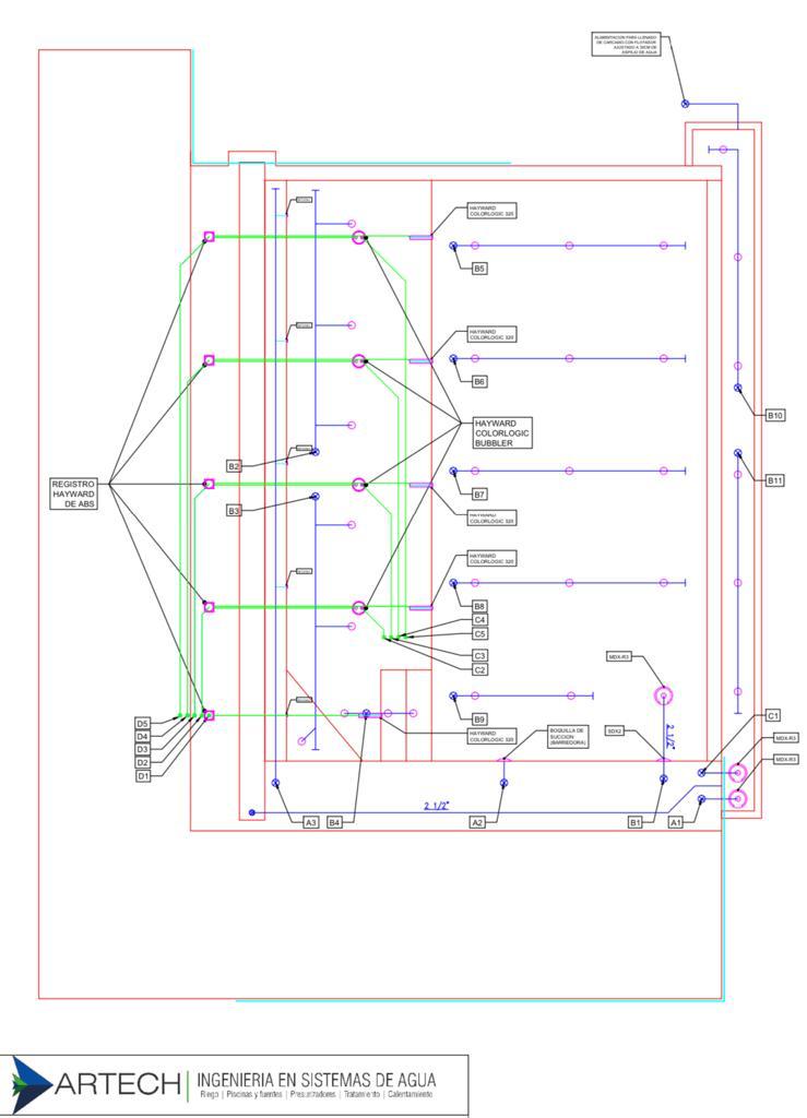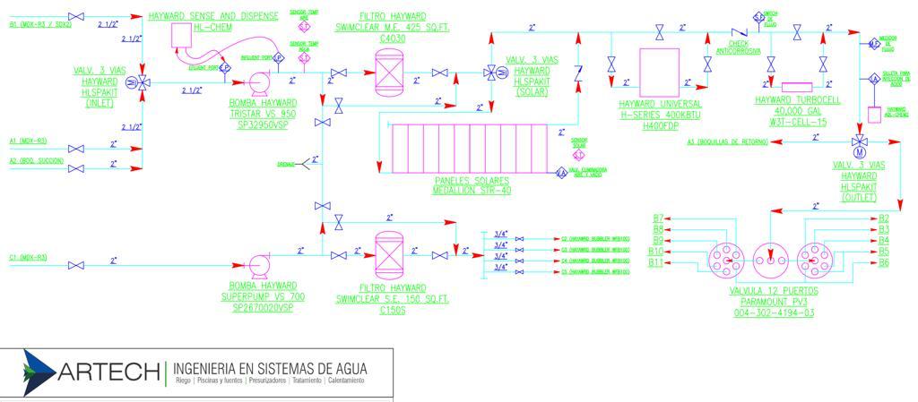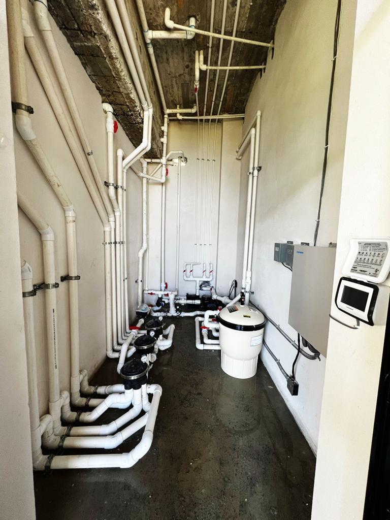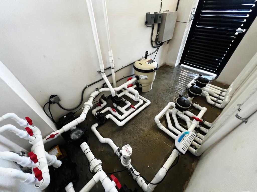 Desarrollo de ingeniería, suministro e instalación de equipamiento para piscina con sistema de automatización, sistema de autolimpieza, sistema de cubierta automática, sistema de bombeo de velocidad variable, sistema de iluminación inteligente, sistema de cloración salina, sistema de calentamiento solar, rebose efecto infinito y borbollones.