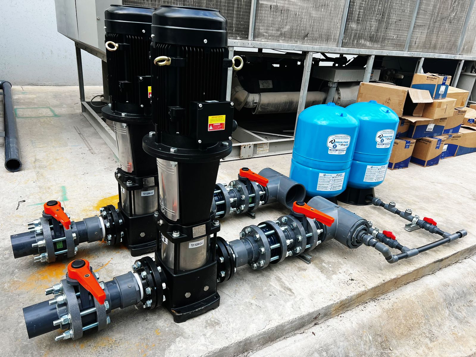 Instalación de sistema de bombeo para sistema de enfriamiento de máquinas inyectoras de plástico en planta industrial en García, Nuevo León.